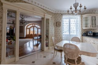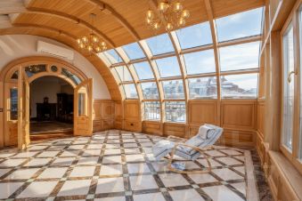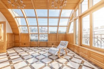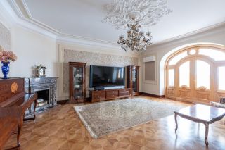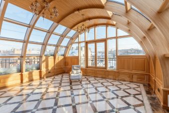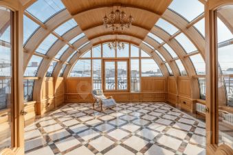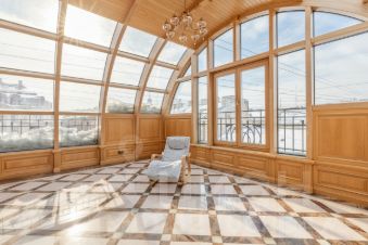 Кухня переходит в гостиную с камином, с последующим выходом на застекленную террасу. Терраса, 30 квадратных метров, выполнена из ясеня с применением гнутых стеклопакетов, что придает квартире уникальность, уют и теплоту.