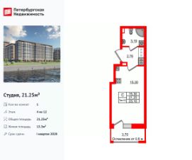 Удобная, классическая, функциональная европланировка, вместительная прихожая 2.76 м². Общая площадь студии - 21.25 м², жилая 15.3 м², высота потолка 2.77 м.