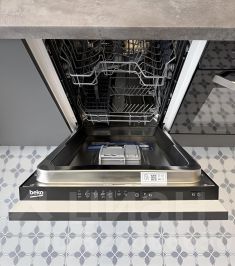 - Просторная кухня полностью укомплектована мебелью и техникой: холодильник, посудомоечная машина, варочная панель, духовой шкаф;