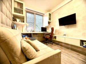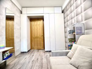 В большой комнате оборудована систем хранения во всю стену с раздвежными зеркальными дверями. Установлена кровать с подьъемным механизмом.