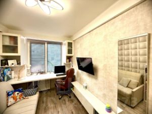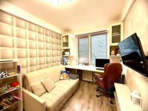 В детской в подарок новому собственнику остается система хранения вещей так же во всю стену, оборудованный письменный стол-подоконник.