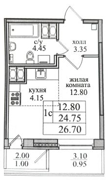 Общая площадь: 24,75 кв.м (комната 16,95 кв.м).