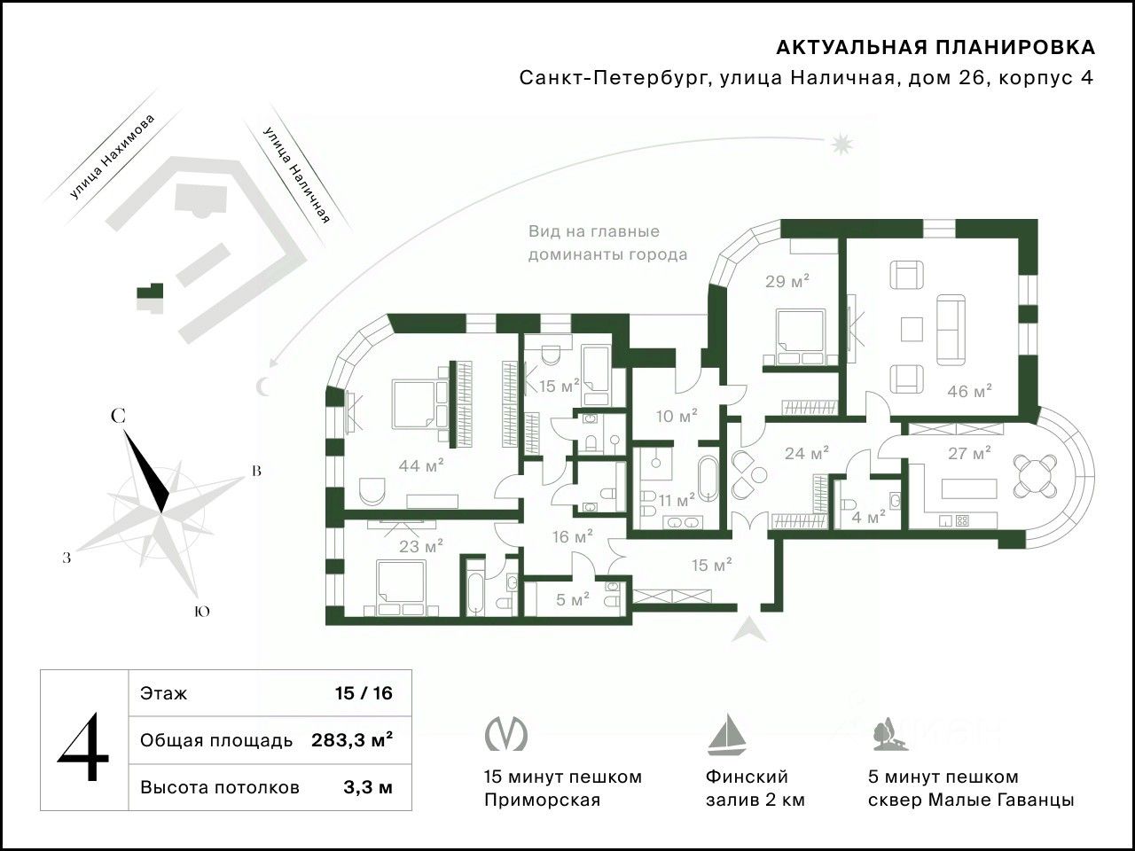 Это район с крайне насыщенной инфраструктурой: рядом торговый центр, магазины, рестораны, Финский залив, парки, пространства "Севкабель" и "Брусницын", а также удобный выезд на ЗСД. До станции метро "Приморская" всего 15 минут пешком.