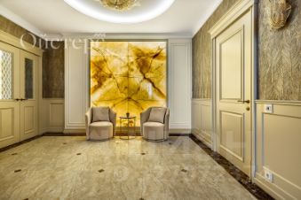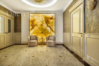 В отделке использованы оникс и мрамор, техника и сантехника от именитых мировых брендов, есть система приточно-вытяжной вентиляции и кондиционирования. Там, где уложена плитка, установлены тёплые полы.