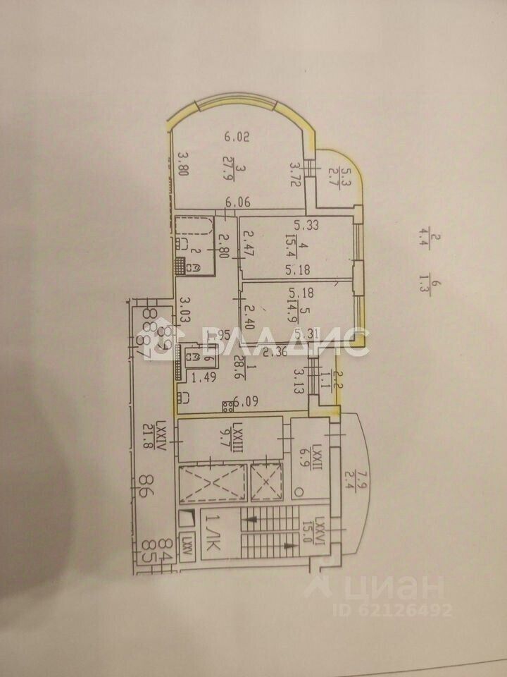Общая площадь квартиры составляет 92,5 кв. м, из которых 15 кв. м приходится на кухню, а 58,2 кв.м. - на жилую площадь.