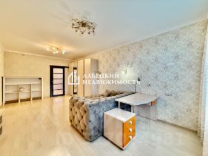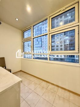 ВМЕСТИТЕЛЬНАЯ кухня-гостиная площадью 18.8 м² правильной прямоугольной формы с выходом на остеклённую лоджию. В кухне ДИЗАЙНЕРСКИЙ кухонный гарнитур со встроенной бытовой техникой, выполненный на заказ.