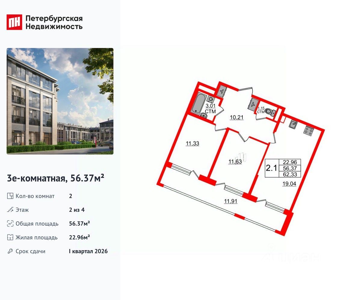 Удобная, классическая, функциональная европланировка, большая кухня-гостиная 19.04 м², просторная прихожая 10.21 м². Общая площадь квартиры - 56.37 м², жилая 22.96 м², высота потолка 2.75 м.
