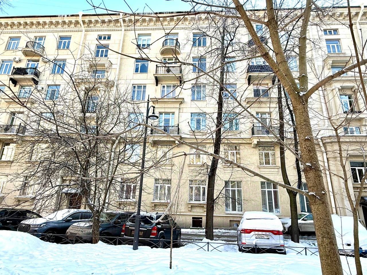 Дом украшен колоннами, масками львов и широкими балконами с баллюстрадами. Ухоженная парадная с металлической входной дверью. Установлен пассажирский лифт. На этаже всего 4 квартиры.
