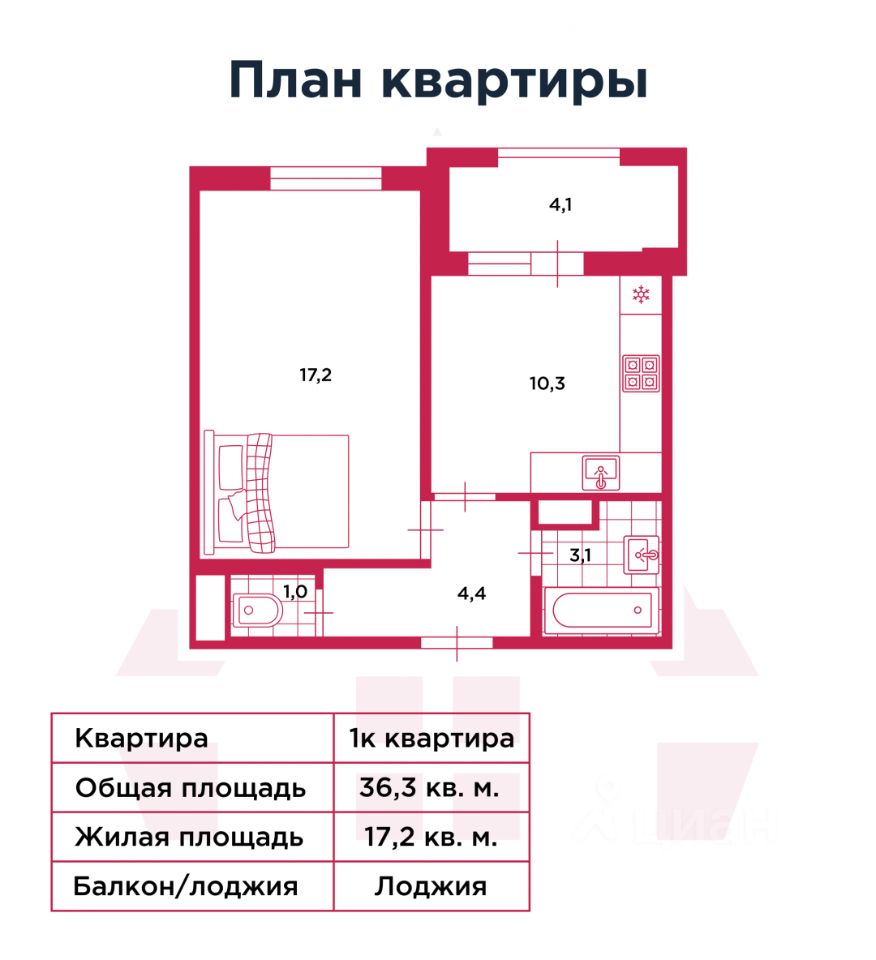Общая площадь 36,3 м². Комната 17,2 м² правильной формы.
