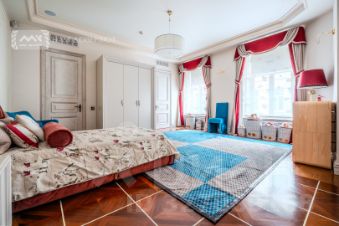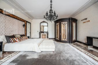 Планировка включает гостиный зал с каминным порталом и выходом на балкон, обеденный зал с чайным (кофейным) уголком, кухонную зону, мастер-блок с тренировочной комнатой, библиотеку-гостиную, гардеробные комнаты, отдельно располагается автономное детское пространство, основная мастер-спальня с балконом, и гостевая спальня.