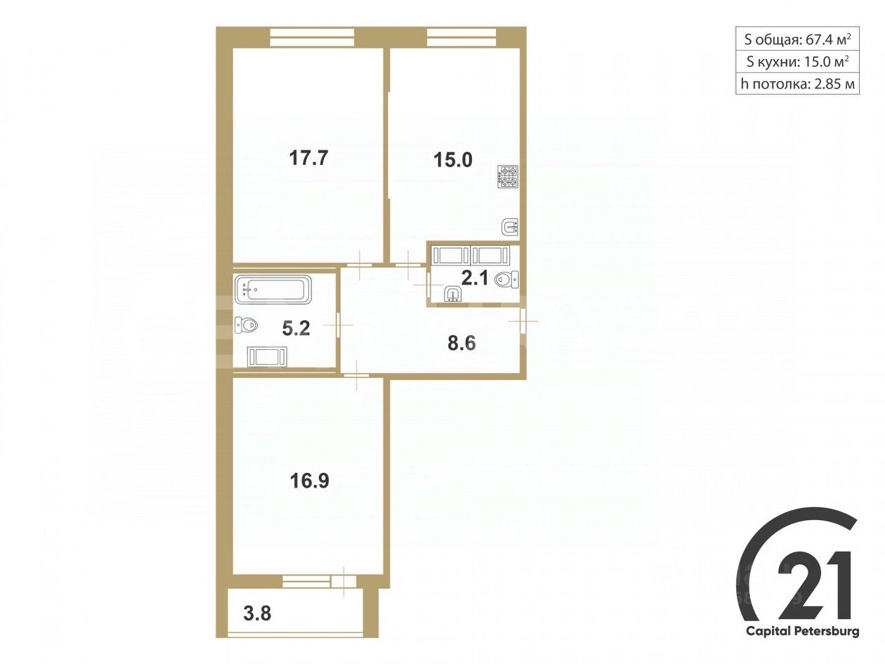 Просторные комнаты — 17,7 м2 и 16,9 м2.