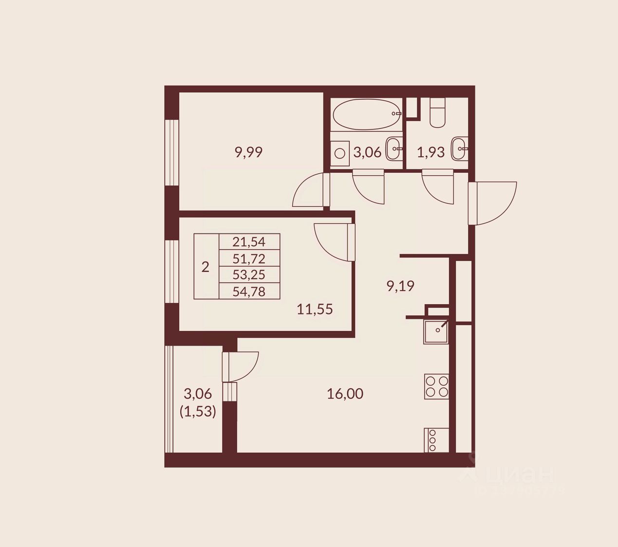 Общая площадь53,25 м²