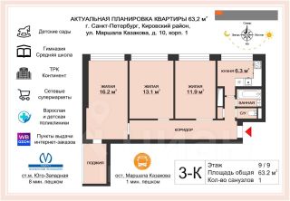 - три изолированные комнаты: 17,3 м2, 16,2 м2 и 11, 9 м2;