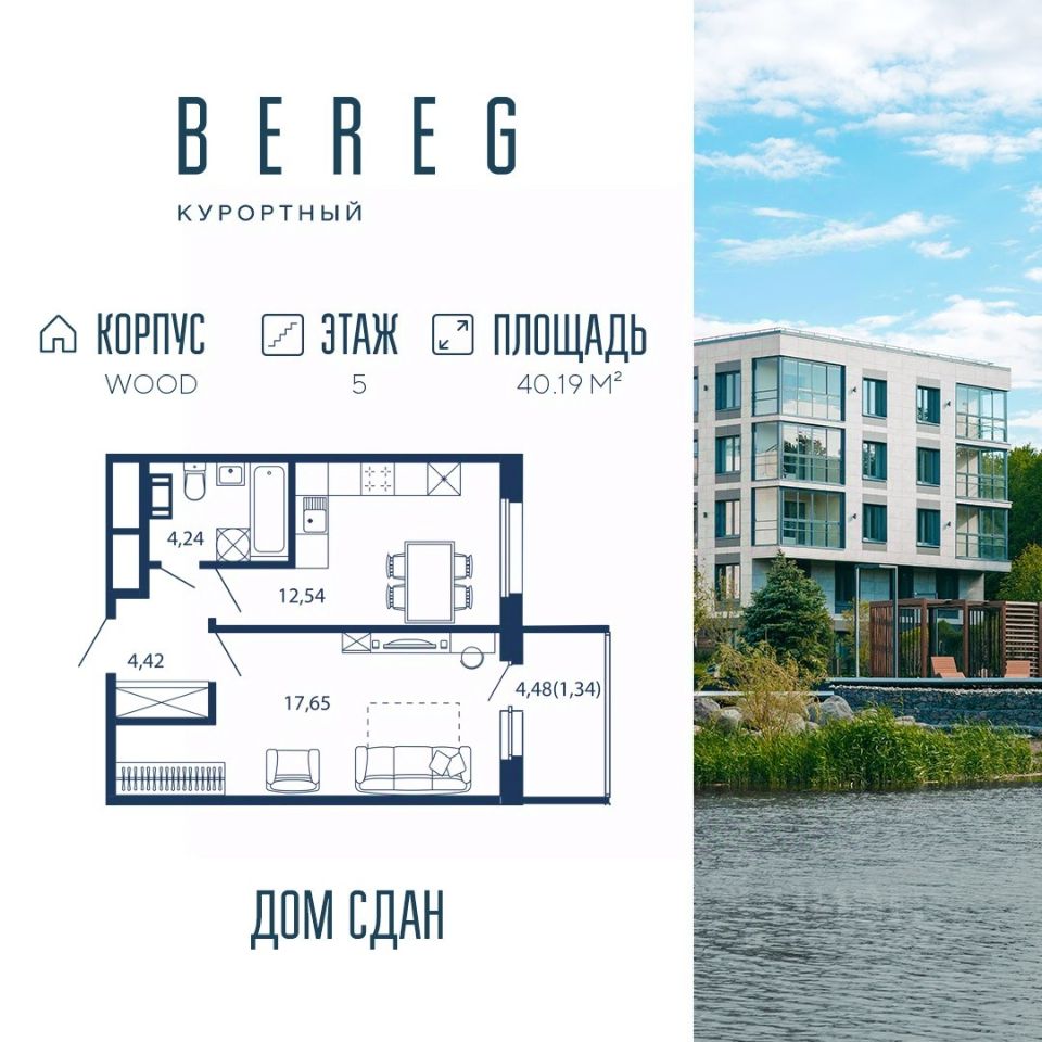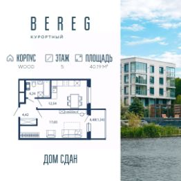 Апартамент 522 площадью 40,19 кв.м. в корпусе Wood с видом во двор