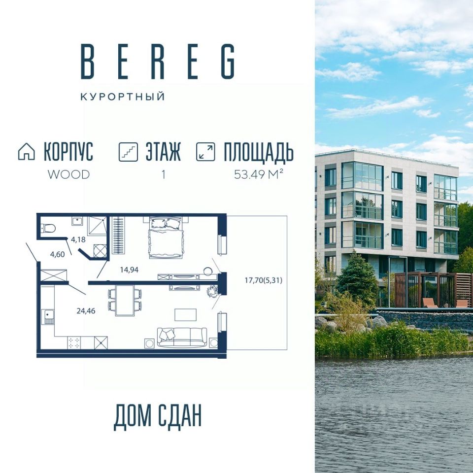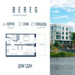 Апартамент 648 площадью 53,49 кв.м. в корпусе Wood с видом во двор