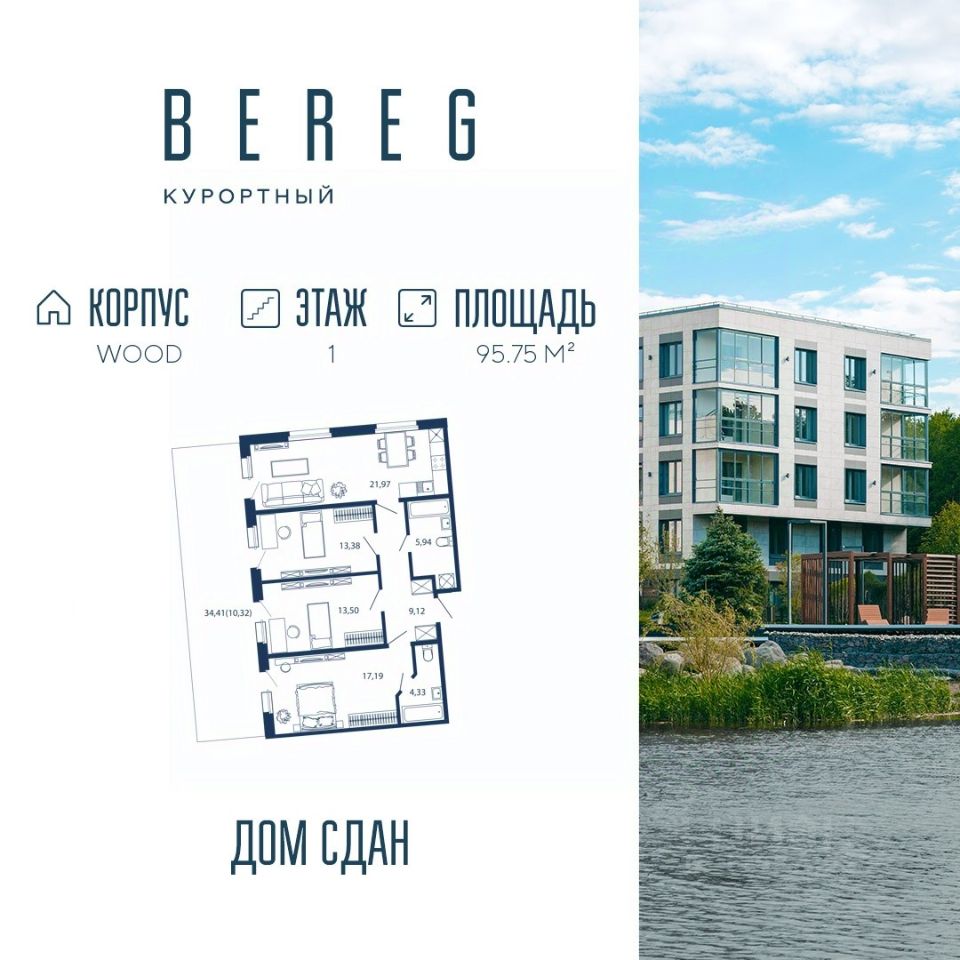 Апартамент 685 площадью 95,75 кв.м. в корпусе Wood с видом на улицу