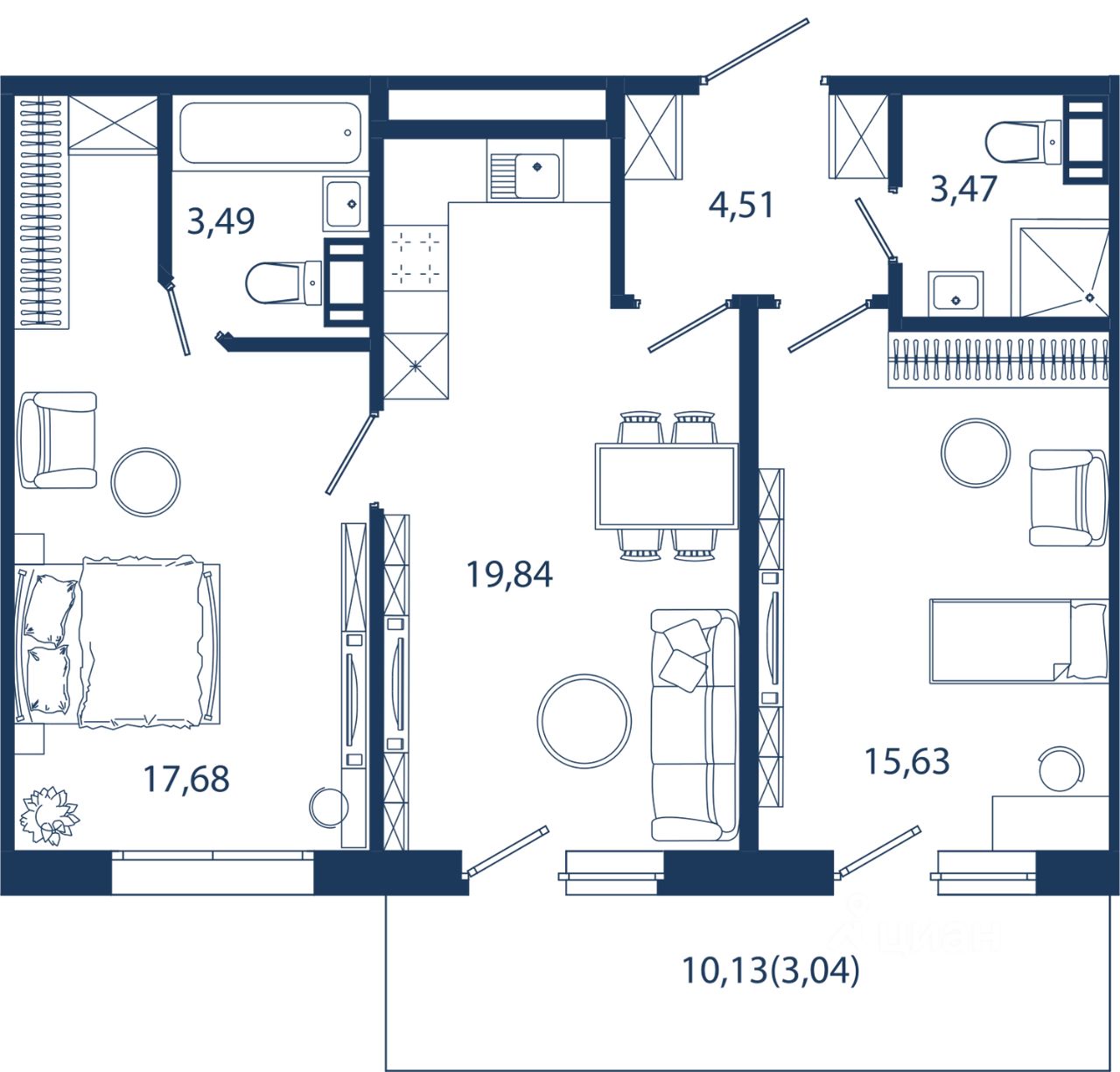 Апартамент 396 площадью 67,66 кв.м. в корпусе Aqua с видом во двор