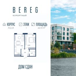 Апартамент 417 площадью 44,91 кв.м. в корпусе Aqua с видом во двор