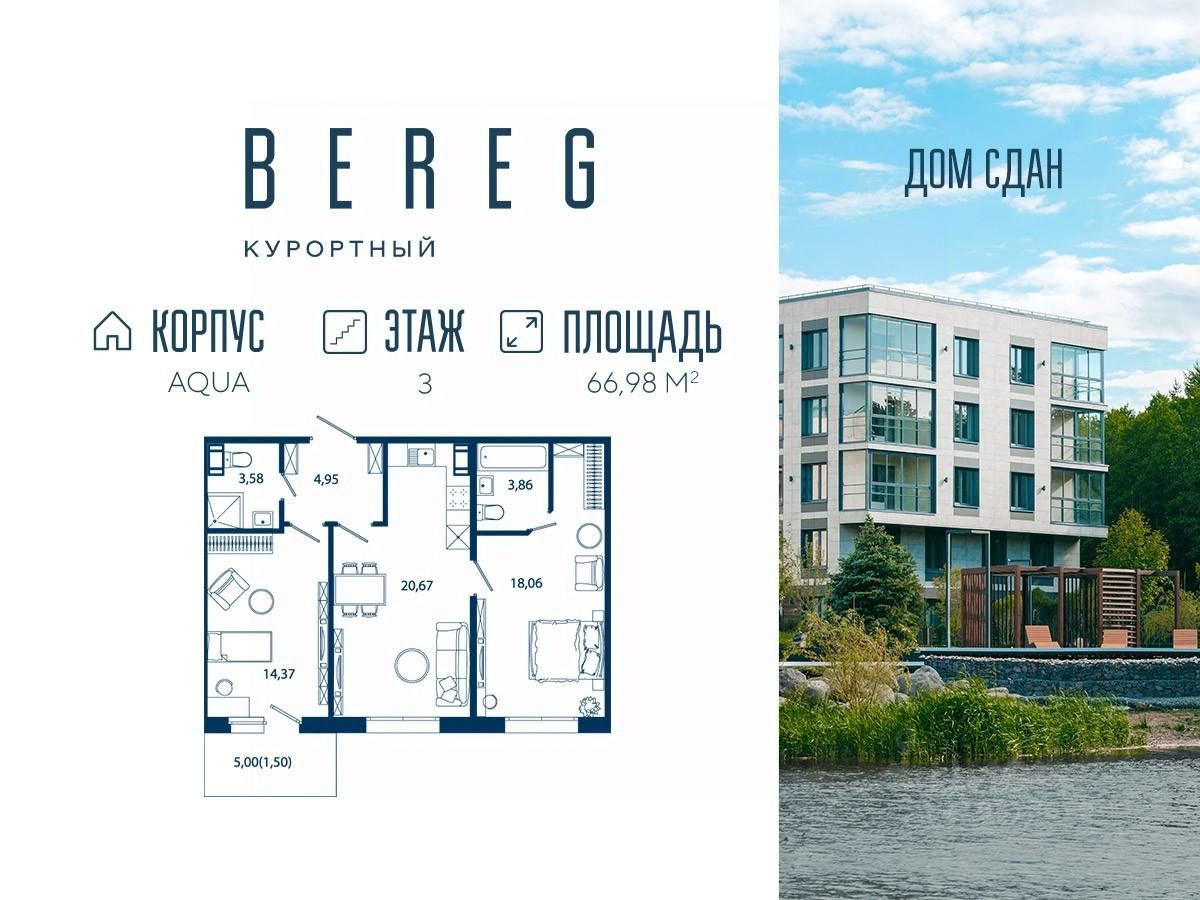 Апартамент 444 площадью 66,98 кв.м. в корпусе Aqua с видом во двор