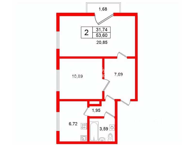 • Общая площадь: 53.6 м2 (жилая — 31.74 м2).