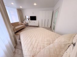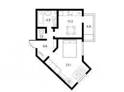 1. Светлая квартира с просторной спальней-гостиной с 2 окнами, большой кухней и большим застекленным балконом.