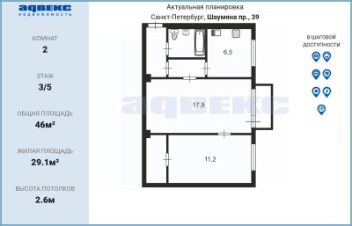 Планировка включает две комнаты площадью 17,9 и 11,2 квадратных метра, а также кухню площадью 6,5 квадратных метров. В квартире выполнен качественный ремонт с использованием современных материалов. Установлены деревянные массивные двери, в санузлах облицовка кафелем. Санузел совмещенный. Имеется гардеробная, балкон, а также установлена газовая плита. В продаже остается мебель как в комнатах, так и на кухне.
