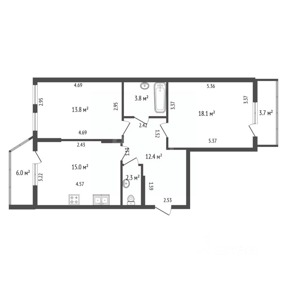 просторные комнаты 18 и 13 м2, кухня-гостинная 15 м2, холл 12 м2,