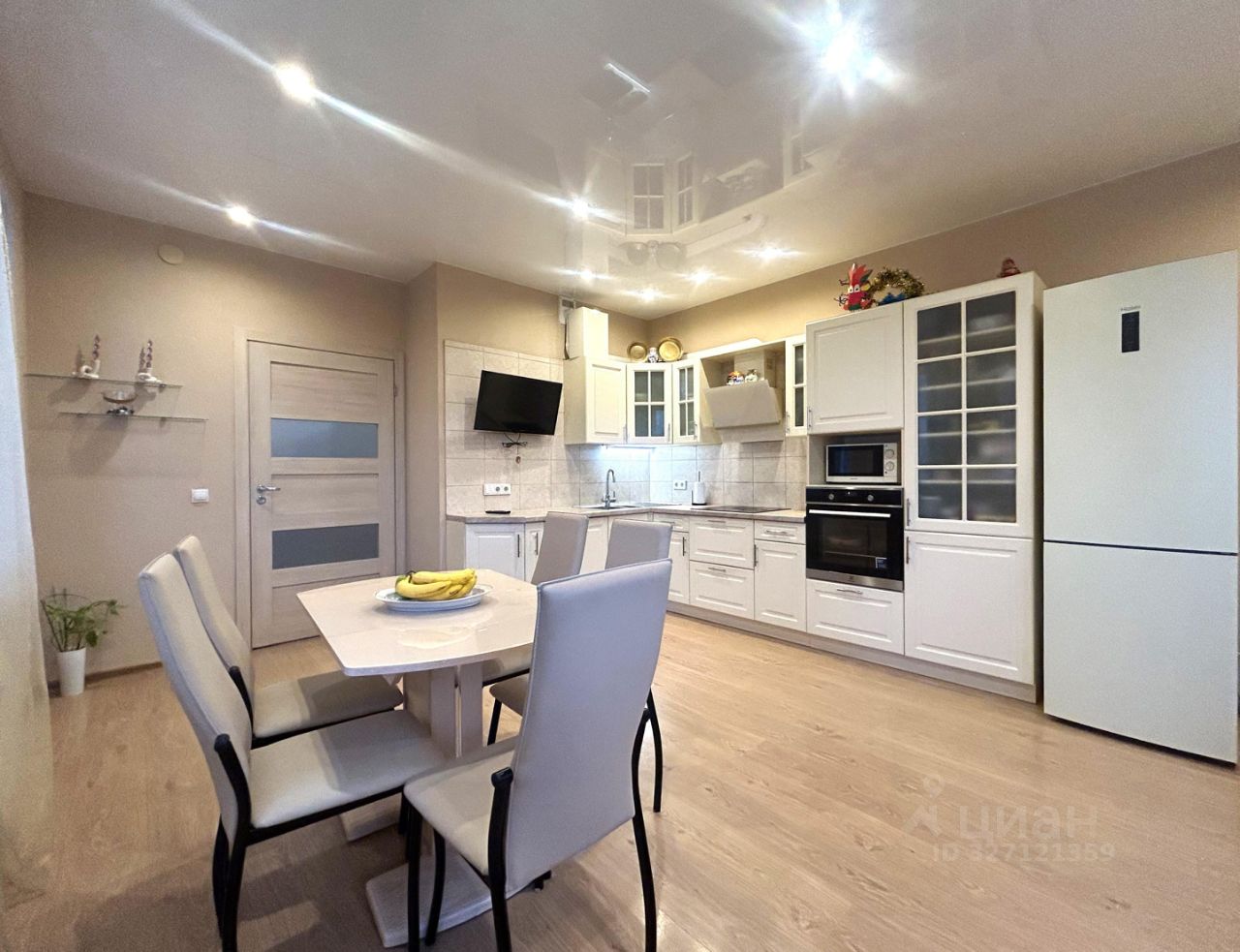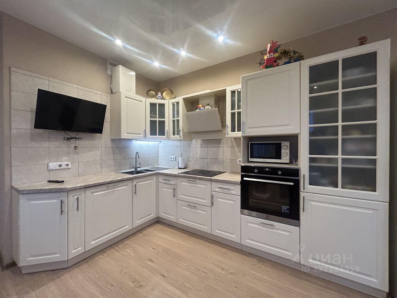 Ремонт произведен. Квартира укомплектована встроенной кухонной мебелью с бытовой техникой (стеклокерамическая варочная панель, вытяжка, духовой шкаф, посудомоечная машина), мебелью в гостиной, комнатах и в коридоре.