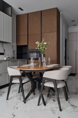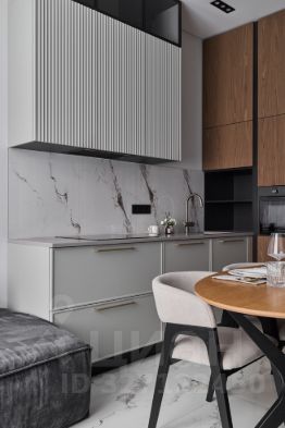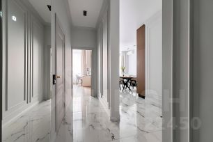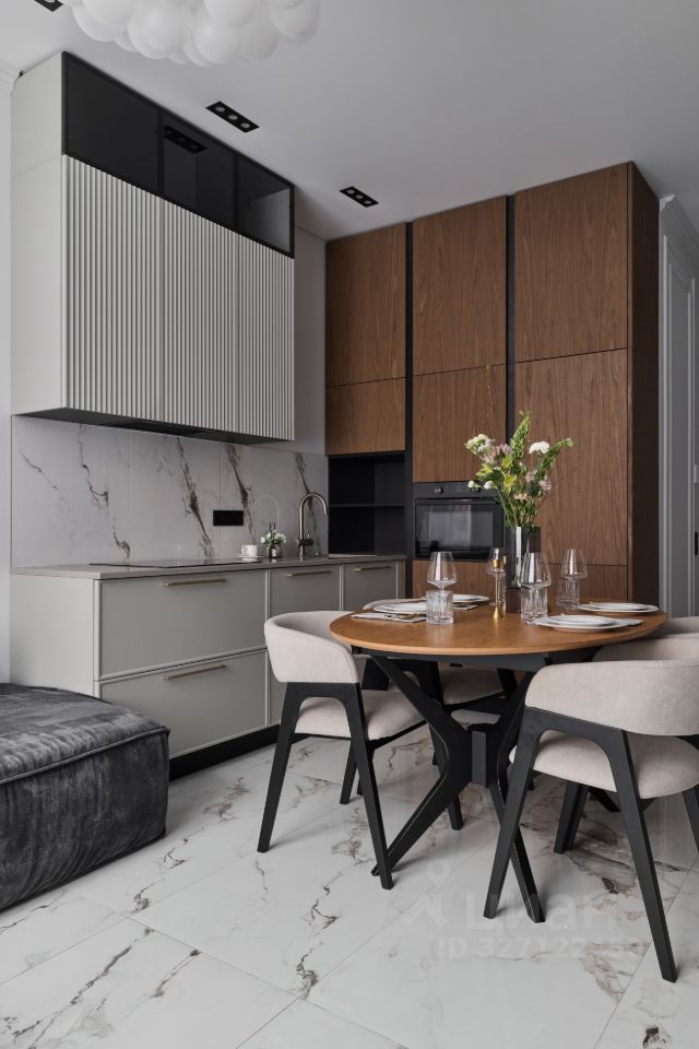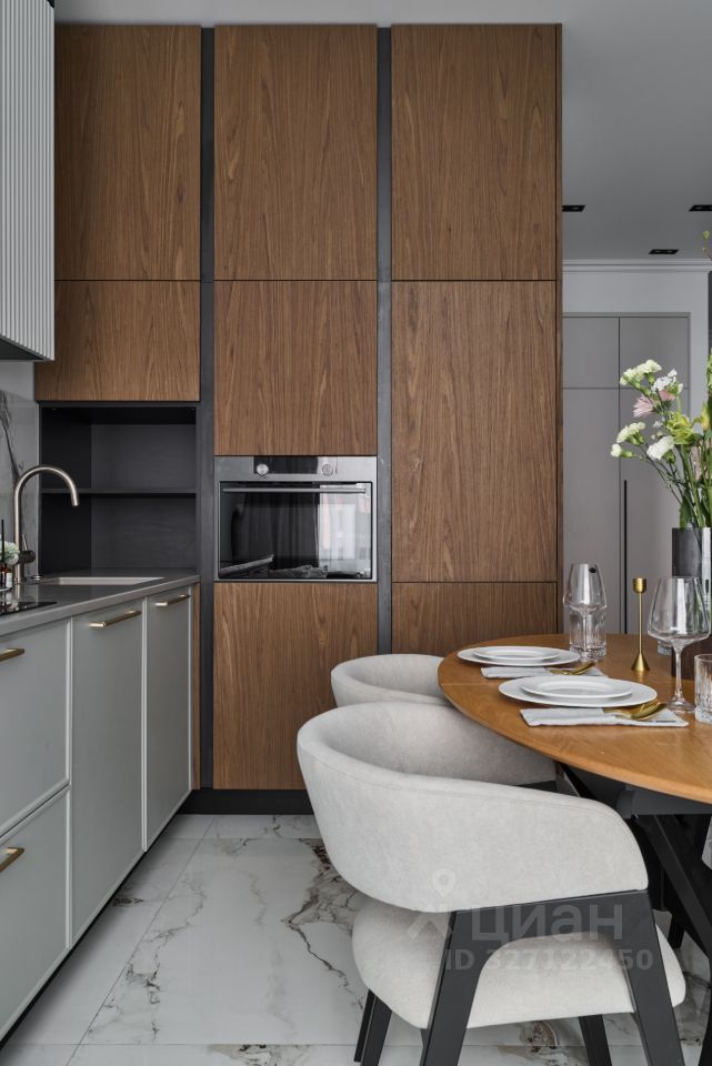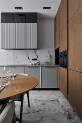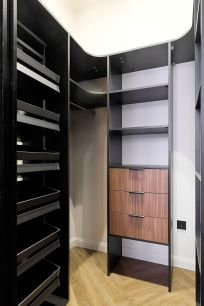 - встроенной мебелью (эмаль, шпон, каменные столешницы), выполненной под заказ