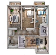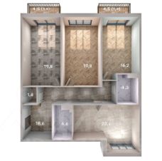 Планировка: три спальни (две с балконами), кухнягостиная с нишей под кухню, два больших санузла (4,3 м² и 4,6 м²).