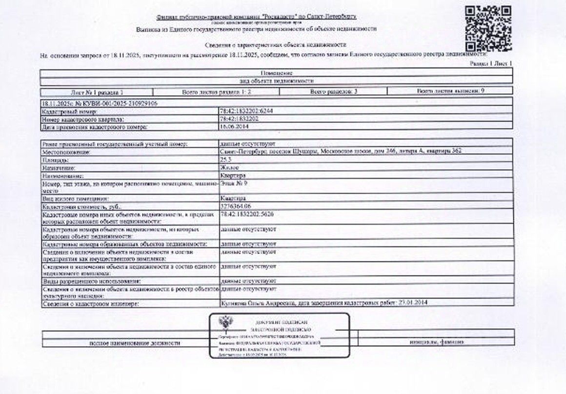 квартира по адресу: г. Санкт-Петербург, п. Шушары, Московское шоссе, д.246, лит. А, кв.362, общ. пл. 25.3 кв.м., кадастровый номер 78:42:1832202:6244