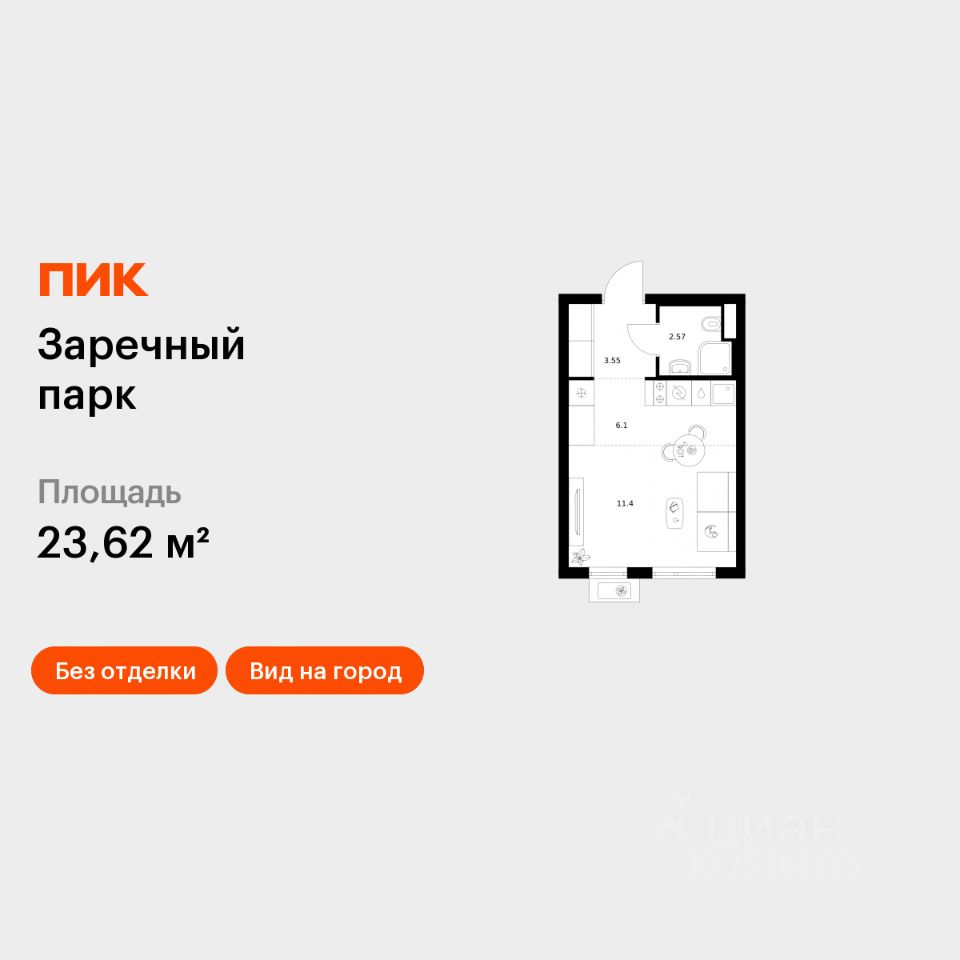Продаётся квартира-студия площадью 23,62 кв.м на 12 этаже 16 этажного дома (Корпус 4, Секция 2) проекта ПИК Заречный парк. Светлый просторный подъезд на уровне земли, функциональная планировка, большие окна, c отделкой.