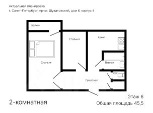 2. Планировка. Чистые 45.5 квадратов. Не распашонка со сквозняками, а уютные раздельные комнаты с просторным коридором. Шестой этаж — золотая середина.