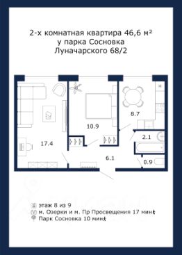 Хорошая транспортная доступность: 17 мин шагом до метро Озерки, до центра города 27 минут езды на автомобиле, 45 минут на общественном транспорте.