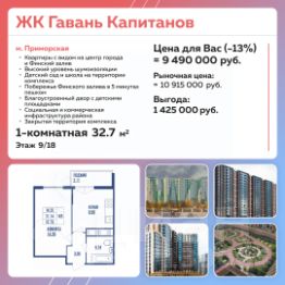 1-комнатная квартира с панорамным видом на Финский залив в ЖК Магеллан (намыв В.О.) Скидка 13% + дополнительная 2%! Цена от собственника — 9 745 000 ₽ Рыночная стоимость 11 540 000 ₽ — ваша экономия почти 1,8 млн рублей Описание: Продаётся просторная 1-комнатная квартира в современном монолитном доме на девятом этаже корпуса Магеллан — части престижного квартала Гавань Капитанов на намывных территориях Васильевского острова. Это идеальное пространство для тех, кто ценит тишину, морской воздух и хочет жить в динамично развивающемся районе рядом с историческим центром Петербурга. Квартира продаётся без отделки — вы сможете воплотить любой дизайн-проект с нуля. Либо закажите готовый ремонт и меблировку у проверенных партнёров (см. раздел Ценовые предложения). Почему стоит выбрать эту квартиру: Вид на залив и набережную — из окон открываются просторы Финского залива, а в шаговой доступности обустроенная набережная для прогулок. Престижный и тихий район — намыв В.О. создан для комфортного проживания вдали от городского шума, но с быстрым доступом к центру. Современный дом — монолит, современные лифты, колясочные и велопарковки, ландшафтный дизайн двора, зоны отдыха и детские площадки. Транспортная доступность — 15 минут до метро Приморская, выезд на ЗСД (20 минут до аэропорта). В перспективе — собственная станция метро на намыве. Всё рядом — торгово-развлекательные центры, школы, детсады, спортивные сооружения, рестораны и парки запланированы и строятся в шаговой доступности. Удобная планировка — общая площадь 32,7 м², просторная кухня 9,59 м², раздельный санузел. Комфортный 9 этаж из 18. О жилом комплексе: Жилой комплекс Магеллан — это часть нового квартала Гавань Капитанов от застройщика Лидер Групп. В проекте три дома, названных в честь великих мореплавателей: Нахимов, Магеллан, Колумб. Это самый молодой и динамично развивающийся квартал Васильевского острова, где создана современная среда обитания с собственной инфраструктурой и уникальной атмосферой морского города. Характеристики: • Расположение: Василеостровский район, ул. Вадима Шефнера, 4 (корпус Магеллан, секция 5) • Площадь: 32,7 м² (кухня 9,59 м²) • Этаж: 9/18 • Тип дома: монолит • Отделка: без отделки (чистовая стяжка, подготовка под чистовую отделку) • Срок сдачи: дом сдан, оформлена собственность (КП) • Дополнительно: современные лифты, колясочные, велопарковки, благоустроенный двор, закрытая территория Инфраструктура и транспорт: Метро Приморская — 15 минут пешком или 5 минут на транспорте. Выезд на ЗСД в 5 минутах — до аэропорта Пулково 20 минут. В районе работают школы и детские сады, строятся новые образовательные центры. Рядом ТРЦ, гипермаркеты, кафе и рестораны. Прогулочная набережная Финского залива, парки и зелёные зоны. Звоните сейчас, чтобы договориться о просмотре! Квартира полностью готова к продаже, показ в удобное для вас время. Уникальное предложение по такой цене долго не задержится!