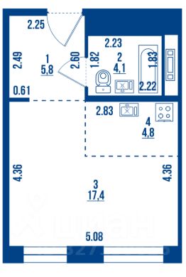 • Площадь: 32,1 кв. м (кухня 5 кв. м)