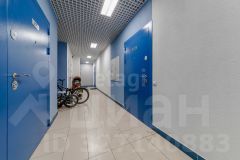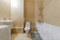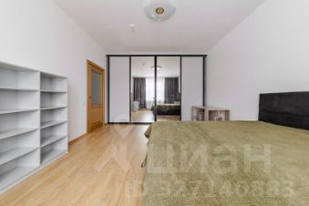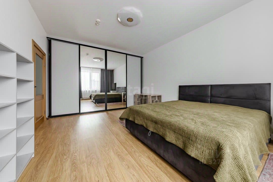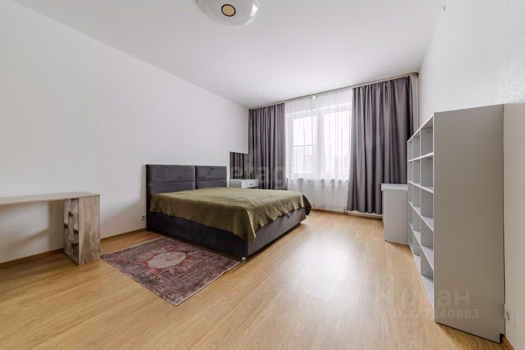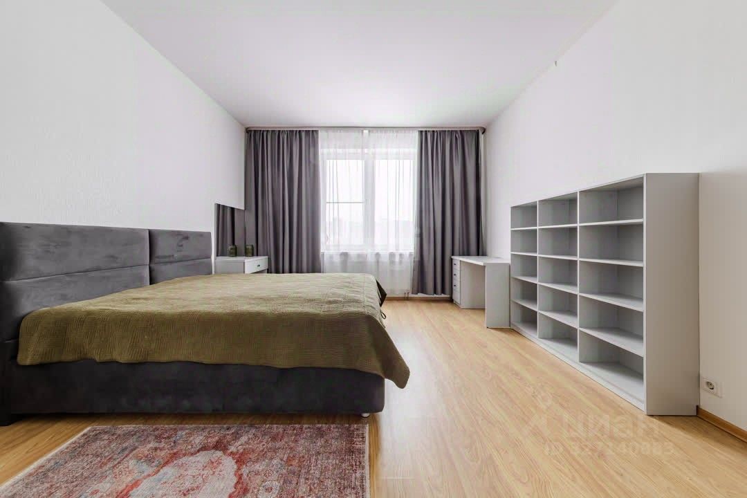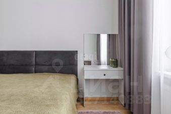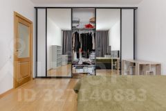 Комната 24.4 кв.м., в которой организована глубокая гардеробная, есть туалетный столик, рабочий стол и двуспальная кровать.