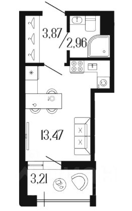 Площадь 21,91 м² (кухня 5 м²)