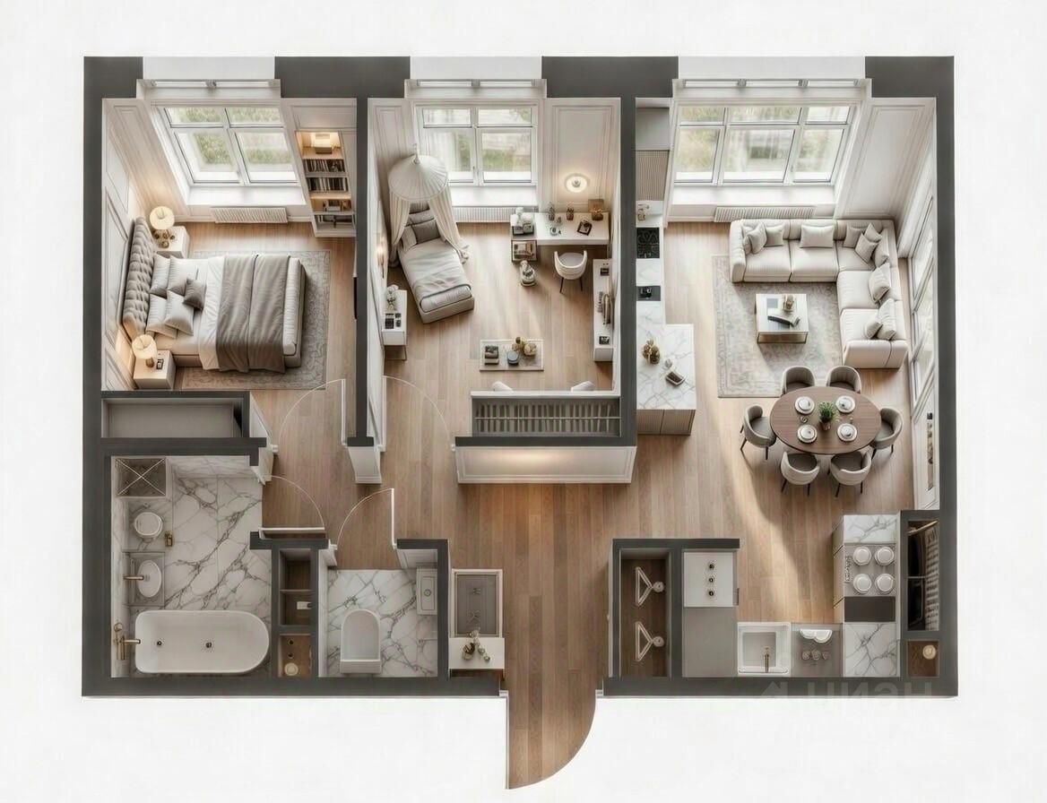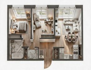 • Кухня-гостиная 21.58 м² — идеальное пространство для семейных ужинов и отдыха, с нишей для кухонного гарнитура и местом под обеденный стол.