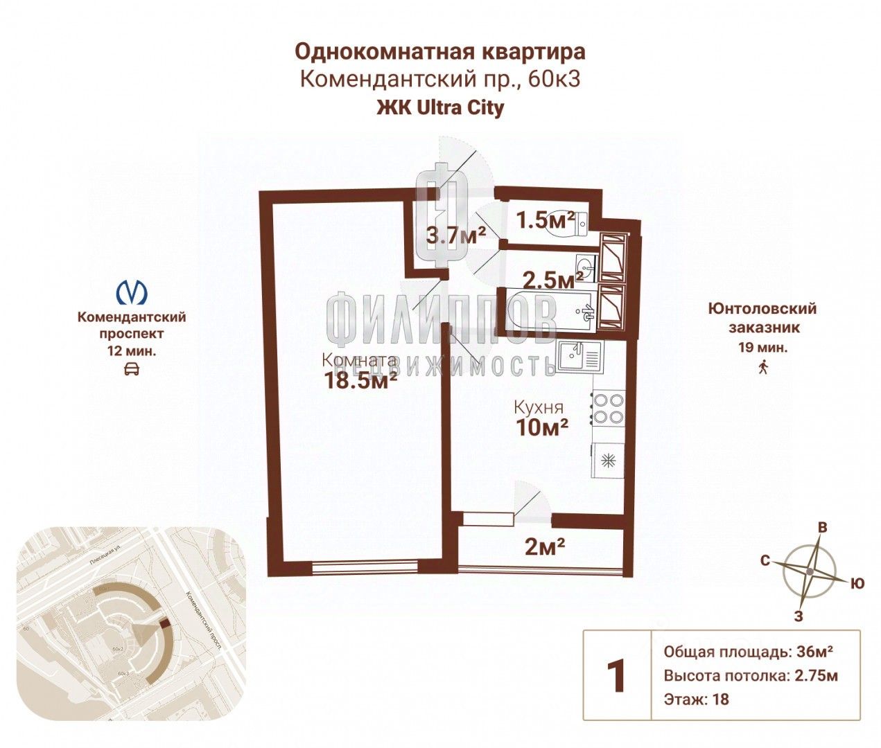 Просторная кухня 10 м² с выходом на остеклённую лоджию 2,1 м² — идеальное место для утреннего кофе. Светлая комната 18,5 м² легко зонируется под спальню и рабочее пространство.