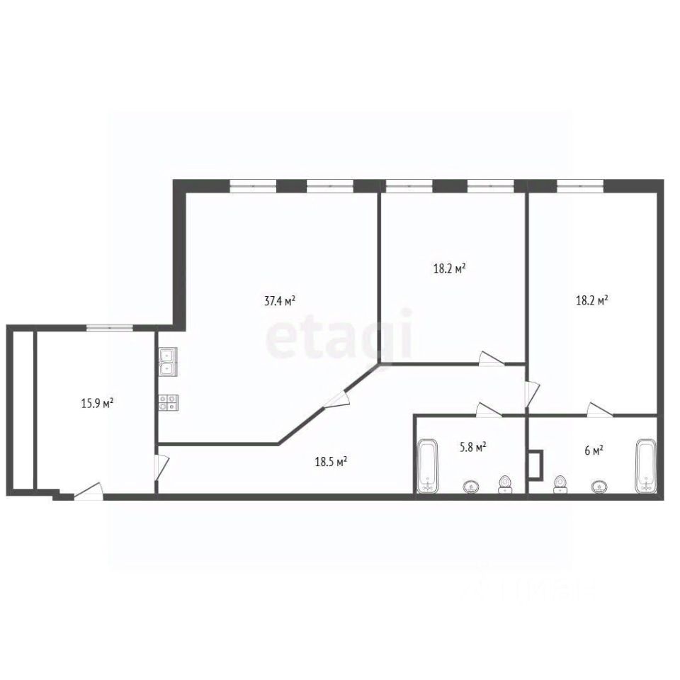 Пространство организовано по принципу свободной планировки: две изолированные спальни, две ванные комнаты, просторный холл и объединенная кухня-гостиная площадью 34,75 кв. м.