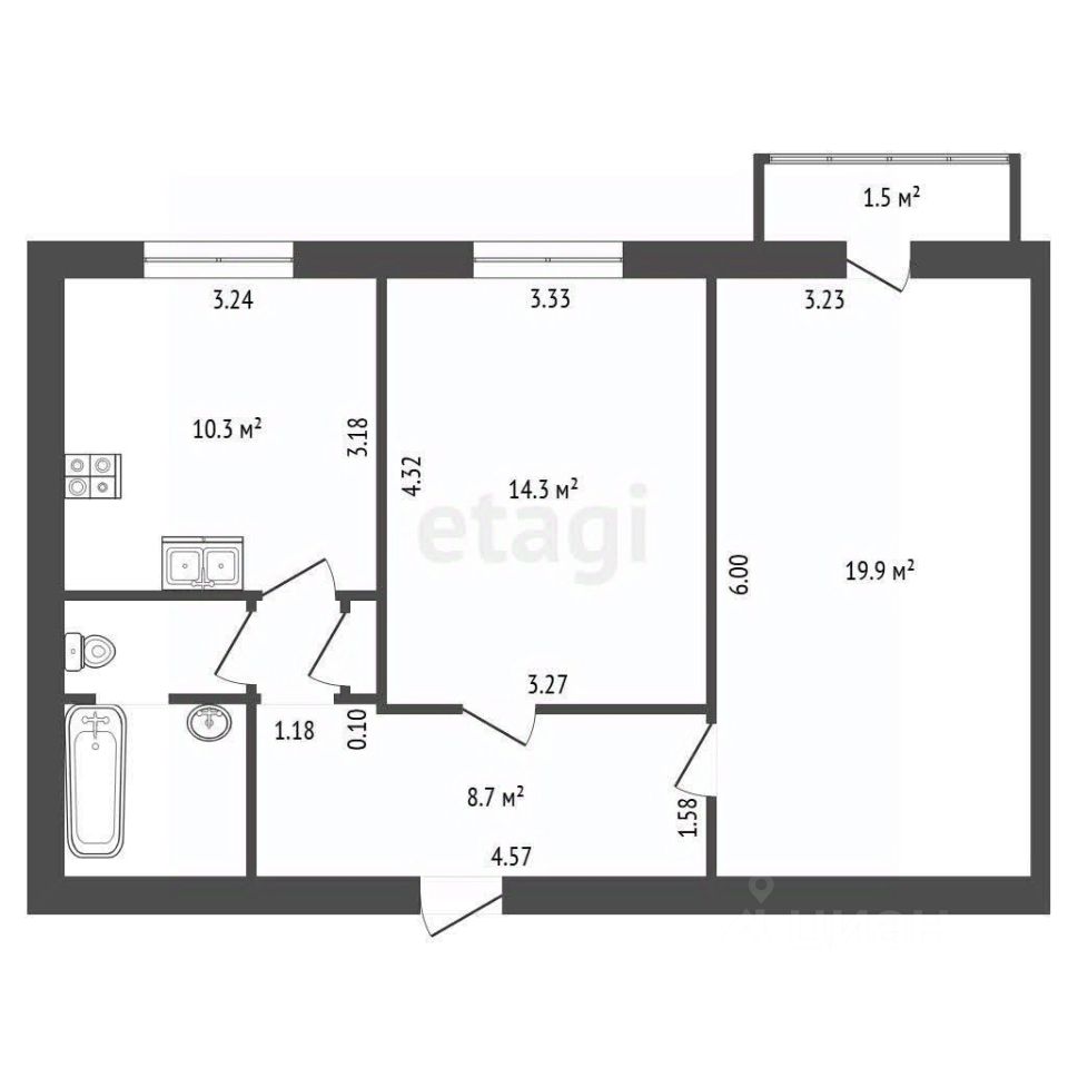 • Площадь 59 м² — удобная основа для современной планировки