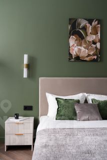 - Мастер-Спальня. Двуспальная кровать (160 на 200) с подъемным механизмом, ящиком для белья и местами хранения. Вместительная гардеробная, выполненная на заказ. Собственный санузел. Тропический душ, зеркало с подсветкой, раковина с тумбой для хранения, инсталляция TECE, тёплый пол, полотенцесушитель. Из спальни выход на лоджию. Кондиционер.