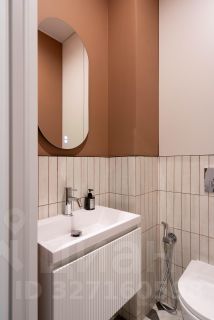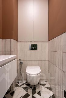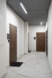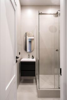 - Просторный коридор с пуфиком, вместительным шкафом для хранения и отдельным техническим шкафом для стиральной/сушильной машины. Вход в гостевой санузел. Гостевой санузел с инсталляцией, в шкафу над коллекторной системой организованы места для хранения бытовой химии.