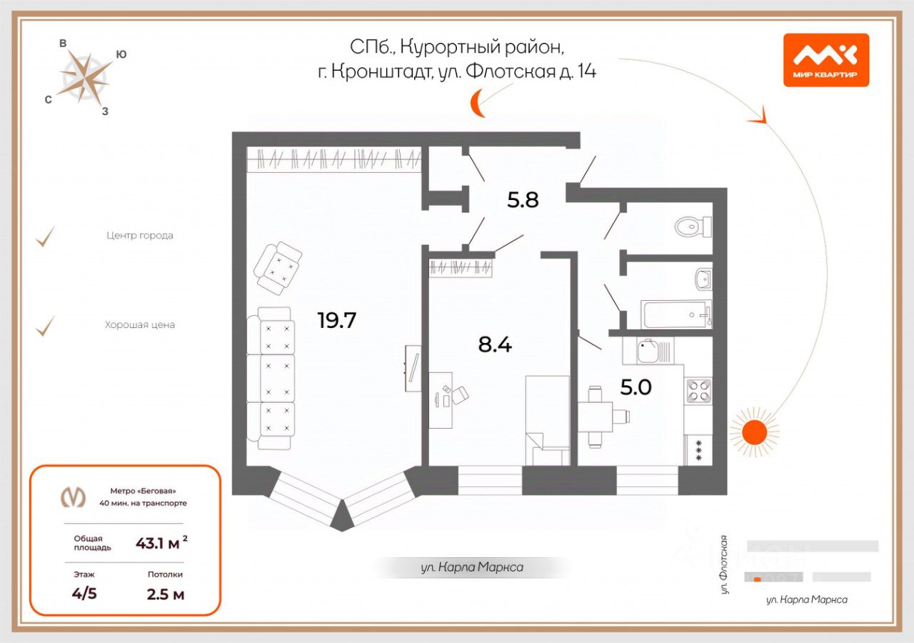 Арт. 129265013 Предлагается к продаже двухкомнатная квартира с эркером в центре Кронштадта! Здравствуйте, уважаемый покупатель! На сегодняшний день город музей Кронштадт является центром притяжения не только туристов, но и тех, кто ценит тишину, близость к природе и хочет жить в этом уникальном историческом месте. Дом 1965 года постройки расположен в самом центре города и отличается очень удачным расположением- в двухстах метрах находится остановка общественного транспорта, откуда отправляются автобусы до станции метро Беговая, метро Старая деревня, метро Проспект Просвещения, а также до г. Сестрорецк и г. Ломоносов. Рядом с домом находится старинное здание Гостиного двора (уменьшенная копия Гостиного двора в СПб), Торговый центр, магазины, парикмахерские, аптеки, школы и детские сады. Квартира расположена на 4 этаже пятиэтажного кирпичного дома,в большом дворе которого находятся зоны для отдыха и детская площадка. Высота потолков в квартире 2,50 м. Окна заменены на качественные стеклопакеты, благодаря чему в квартире очень тихо и тепло. Окна двух изолированных комнат, площадью 19,7м2 и 8,4м2, а так же кухни, площадью 6 м2 выходят на спокойную улицу, по которой вы за 3 минут дойдёте до излюбленного места отдыха горожан Андреевского сквера и Поющего фонтана. Недалеко от дома находится Владимирский собор, который интересен благодаря своей истории, архитектуре и интерьеру! Куполом собора Вы сможете любоваться из окон квартиры! До полюбившегося всеми туристами и жителями города острова Фортов Вы сможете совершать ежедневные пешие или велосипедные прогулки, наслаждаясь свежим морским воздухом и потрясающими пейзажами! Квартира подойдёт как для собственного проживания, так и для выгодной сдачи в аренду! В квартире один собственник! Прямая продажа! С удовольствием приглашаю Вас на просмотр и сделку! Предлагаем ПРЕМИАЛЬНОЕ обслуживание для требовательных клиентов. Оперативно организуем просмотр, предоставим полную информацию по объекту. 20 лет работы с требовательными клиентами подготовили нас к решению ВАШИХ сложных задач. Будем рады знакомству! Ул. Рубинштейна, д.8.