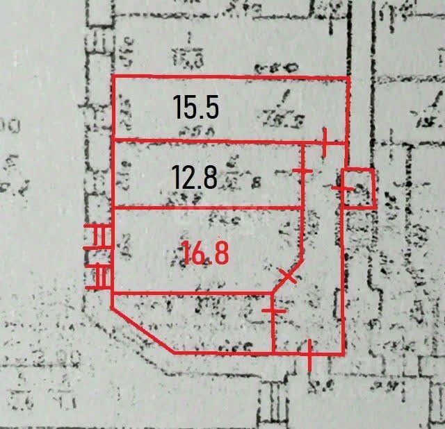 площадью 16,8 кв. м в трехкомнатной коммунальной квартире общей площадью 65,9 кв. м.