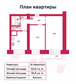 Общая площадь 50 м². Комнаты: спальня 12,3 м² и просторная гостиная 18,5 м².