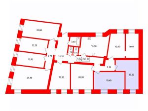 Площади комнат 19.4 кв.м. и 17.3 кв.м. Три окна. Высота потолков 3.03 м. Общая кухня светлая и просторная 18.5 кв. м.