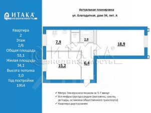 1-92846 Санкт-Петербург, ул.Благодатная, 34 (Московский р-н): продается 2-комнатная квартира площадью 53.1 кв.м, расположенная на 2-м этаже 6-этажного блочного дома 1954 г.п.