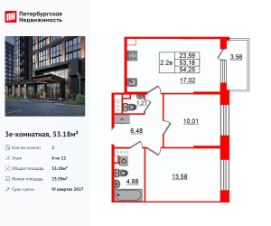 Удобная, классическая, функциональная европланировка, большая кухня-гостиная 17.02 м², вместительная прихожая 6.48 м². Общая площадь квартиры - 53.18 м², жилая 23.59 м², высота потолка 2.75 м.